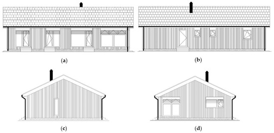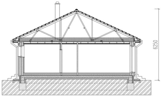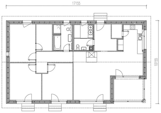 The unit of the study was represented by the whole single-story residential building with a compact shape designed for a family of four to six members (Figure 2, Figure 3 and Figure 4). The floor plan solution was ready-made by Inardex, Co. (Trenchin, Slovakia) [22] and the construction composition was adjusted by the authors to meet the passive building target values of heat transfer coefficient given by the Slovak Technical Standard [23]. The load-bearing structure consisted of a solid wood panel system based on CLT. The foundations consisted of a reinforced concrete ground slab. The gable roof structure was supported with trusses. Dimensions of the CLT panel were 120-mm thick in the peripheral wall and 80-mm thick in partitions. The material composition was composed mainly of natural construction materials, such as CLT panel, glued solid timber and oriented strand board. The thermal insulation consisted of wood fiberboards placed in a supporting grid of I-profile beams. The external layers of the structure consisted of a wood fiber thermal insulation contact system and wood cladding. The heat transfer coefficient of peripheral wall was calculated according to the Slovak Technical Standard [23] and equaled to 0.141 W.m−2K−1. Aluminum frame windows with triple glazing were used. The measures of the construction were defined by the gross external area of 174.2 m2; gross internal area of 148.5 m2, and net internal area of 142.1 m2.
