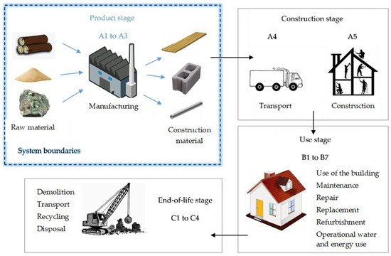 International Organization for Standardization (ISO) and the European Committee for Standardization (CEN) both have sets of standard documents defining the environmental assessment process for construction materials and buildings. Life Cycle Assessment (LCA) is an analytical method evaluating the impact of products, services, and organizations on the environment under the conditions set by ISO 14040 and 14044 [9,10] through several categories, of which global warming or climate change are the most common. Specific standards for LCA in the construction sector include CEN’s EN 15978 [11] as a part of standards for assessing the environmental performance of a building and ISO 21931-1 [12] dealing with buildings sustainability.