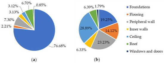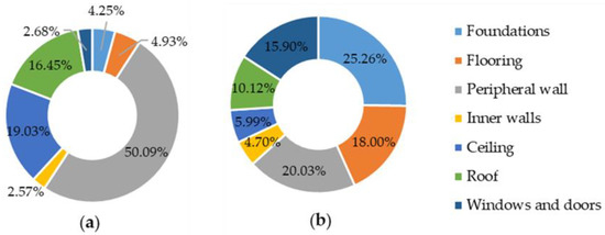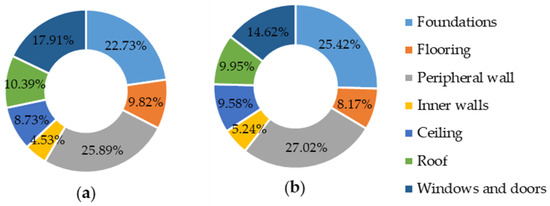 First, the weight and volume of the construction components were assessed (Figure 6). Foundations occupied the majority (76.68%) of the overall weight distribution. Peripheral wall (7.30%) and roof (6.70%) were the second and third heaviest, respectively. The rest component distribution was below 5%. By volume, the most significant share was represented by the ceiling (28.89%), followed by the peripheral wall (23.23%), foundations (19.25%), and flooring (14.12%). The contribution of other components reached a maximum of 6.39% in the case of the roof.
