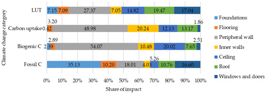The impact of inner walls was the lowest in the LUT (7.05%) and fossil carbon emissions category (4.03%). Foundations were identified to have the lowest embodied impact in carbon uptake and biogenic carbon emissions equal to 0.42 and 2.39%, respectively.