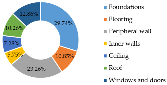 Foundations reached 35.13% of the total embodied fossil carbon emissions, followed by the peripheral wall (18.01%); windows and doors (16.60%); roof (10.76%), and flooring (10.20%), respectively.
