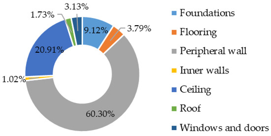 Most of the embodied water consumption was assigned to the peripheral wall (60.30%) (Figure 10). Ceiling accounted for 20.91%, and foundations were responsible for 9.12% of the impact, respectively. Other components reached less than 4% of the impact, each leaving the inner walls the least damaging part of the studied construction.