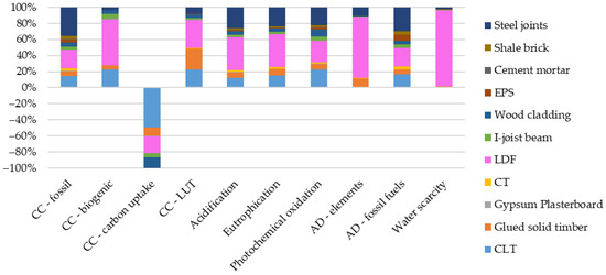 Foundations and peripheral wall were identified as the worst components. The impact contribution of foundations was caused by concrete and reinforcing steel. Except for water scarcity and depletion of elements, the contribution of foundations on individual impact categories was higher than 22%, which roughly matches the findings of Ondova et al. [30]. LDF was marked as the main environmental impact contributor of the peripheral wall component causing the majority of the impact on the depletion of elements and water scarcity (Figure 12). The CLT panel reported the greatest impact of the inner walls (Figure 14), which is understandable given that inner walls were composed of a low number of construction materials, and since the panel was the main element of the component.