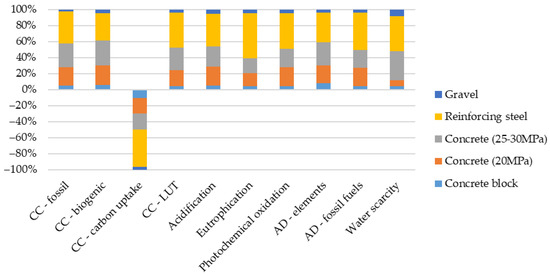 Second, the impact assessment of the structure was performed. Table 2 summarizes the environmental impact of the whole structure. The climate change impact category was divided into fossil carbon emissions, biogenic carbon emissions, carbon uptake by vegetation, and carbon emissions resulting from land use and transformation. Biomass uptake of carbon was detected as the most represented part of the climate change category accounting for −87.96 t CO2 eq. Carbon emissions from fossil sources, biogenic decomposition, and LUT activities reached 76.28 t, 19.86 t, and 291.41 kg of CO2 eq, respectively.