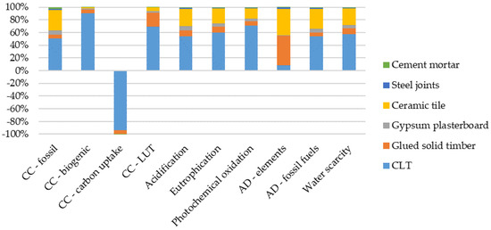 Assessing the inner walls material contribution, CLT was found to bear most of the impact in all categories except depletion of elements led by glued solid timber (Figure 14). Ceramic tiles contribution in the stated category was the second highest.