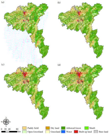 Figure 1. Spatially explicit land-use maps of the CZT urban agglomeration in (a) 2000, (b) 2005, (c) 2010, and (d) 2015.