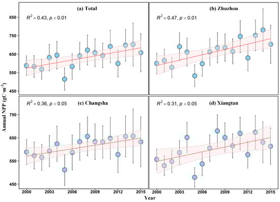 Figure 2. Temporal variation in annual NPP (gC•m−2) in the CZT urban agglomeration from 2000 to 2015. (a) The total values for CZT; (b) the values for Zhuzhou; (c) the values for Changsha; (d) the values for Xiangtan. Note: The red line indicates the linear fitting during the period from 2000 to 2015. The p-value documents the significance. Error bars extending from the means document the standard deviation of annual NPP, while the light red region is the 95% confidence intervals of the linear model.
