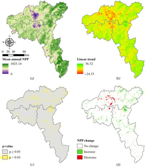 Figure 3. Spatiotemporal variations in annual NPP (gC•m−2) in the CZT urban agglomeration at the pixel level between 2000 and 2015. (a) Average annual NPP; (b) change trends of annual NPP (gC•m−2); (c) p-value of the t-test for the modeled slopes; (d) the NPP change types. Note: The least-square linear regression model was applied to analyze the temporal variation in annual NPP between 2000 and 2015 for each pixel. The changing trend is described by the modeled slope in (b). In (d), “No change” documents that the annual NPP did not change (a = 0 and p ≤ 0.05) or did change, but not significantly (a ≠ 0 and p > 0.05).