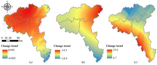 In the study area, temperature, precipitation, and solar radiation indicated different linear change rates of 0.035 °C•yr−1, −0.241 mm•yr−1, and 3.886 MJ•m−2•yr−1, respectively, from 2000 to 2015. Figure 4 shows that the spatial distribution characteristics of them are quite different. The temperature had an increasing trend in most regions, except the southern region of CZT (Figure 4a). The increased precipitation was mainly concentrated in the northeast, while the southern area had decreased precipitation (Figure 4b). For solar radiation, the northeast of the study area showed a decreasing trend, but the western and southern regions showed an increasing trend from 2000 to 2015 (Figure 4c). Based on the scatters and fitted linear correlations analysis, we found that the annual NPP positively correlated with temperature (Figure 5a) and solar radiation (Figure 5c) but negatively correlated with precipitation (Figure 5b). The correlation coefficient between NPP and temperature was lower in the north central part of the study area, but a higher correlation coefficient was sparsely distributed in the central parts of the CZT area (Figure 6a). For precipitation, higher correlation coefficients were distributed in the northeast region (Figure 6b). However, the opposite distribution could be observed for the correlation coefficient between NPP and solar radiation in the study area (Figure 6c).