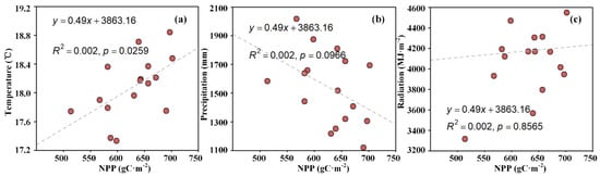 Figure 5. Scatters and fitted linear correlations between annual NPP and (a) temperature, (b) precipitation, and (c) radiation in the CZT urban agglomeration.