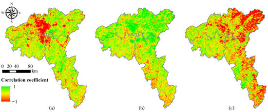 Figure 6. Spearman’s rank correlations between the annual NPP and climate variables in the CZT urban agglomeration from 2000 to 2015. (a) NPP–temperature; (b) NPP–precipitation; (c) NPP–radiation.