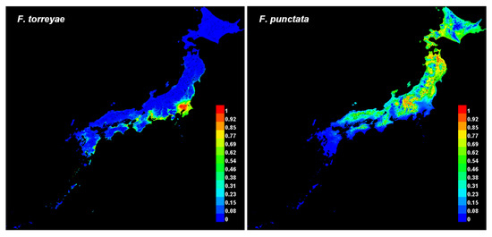 The presence probability of F. torreyae by Maxent analysis was higher in coastal areas along the Pacific Ocean from the middle part of the Tohoku region (around Sendai) toward southern Japan than in other areas (Figure 1 and Figure S1). Meanwhile, the probability of F. punctata was higher in mountainous areas from the middle parts of the Shikoku and Chugoku regions toward northern Japan (Figure 1 and Figure S1). The AUC values (average ± standard deviation) of F. torreyae and F. punctata predictions were 0.960 ± 0.006 and 0.889 ± 0.040, respectively.