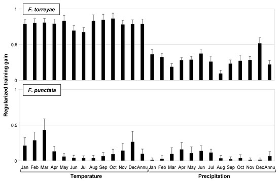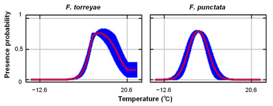 Fungal species distribution is possibly affected not only by climatic conditions such as temperature, precipitation, and solar radiation but also by the distributions and conditions of host trees, e.g., [26,27,28,29,30]. The collection records of F. torreyae and F. punctata [7,10,11] suggest that their host and substrate preferences are likely to be broader than those of several wood-decay fungi distributed in temperate areas of Japan [31,32]. Thus, we suggest that their distributions are scarcely affected by host tree distribution. However, other climatic factors including an interaction between temperature and precipitation may affect their distributions as we only included temperature and precipitation variables as environmental variables in the Maxent analyses and, based on a jackknife test, separately evaluated the gain of each variable in the models.
