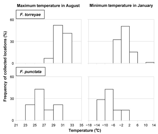 The published collection data often lacked detailed locality names or latitude and longitude data to indicate the exact point of collection. Of these cases, the specimens deposited in TFM were re-examined by investigating the herbarium records to provide more detailed geographical ranges of the collection sites. The latitude and longitude data were lacking for most samples, but we successfully restricted most of the collection sites into areas narrower than 1 × 1 km. The collection data of duplicate localities were removed from the analysis. Later, the latitude and longitude near the center of each collection site were recorded on Google Maps because exact collection points were unknown. For ten sites of F. torreyae and seven sites of F. punctata, we failed to restrict the collection sites into areas narrower than 1 × 1 km but succeeded in restricting them to areas narrower than 5 × 5 km. These collection data were also included in the analysis due to the low number of samples used for the analysis, especially for F. punctata. In total, we prepared 73 and 14 presence data of F. torreyae and F. punctata, respectively (Figure S1 and Table S1).