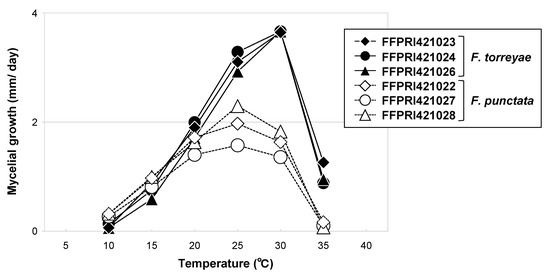 Mycelial growth of Fomitiporia torreyae and Fomitiporia punctata isolates at different temperatures. Values indicate means (n = 3).