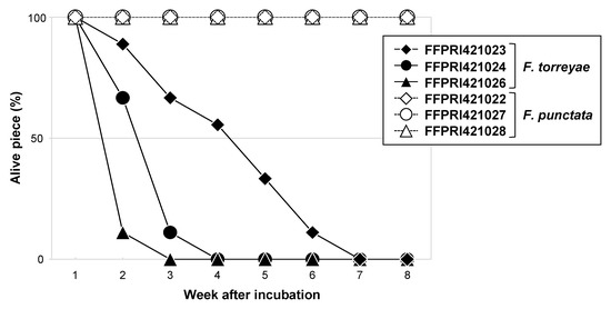 Both species survived at 0 °C for at least 2 months, irrespective of the isolate. Some mycelial pieces of F. torreyae were dead after 2 weeks of incubation at −5 °C, and the numbers of dead pieces increased with longer incubation (Figure 6). Meanwhile, no mycelial pieces of F. punctata died throughout the experiment, and the proportions of live pieces were always higher than those of the F. torreyae isolates.