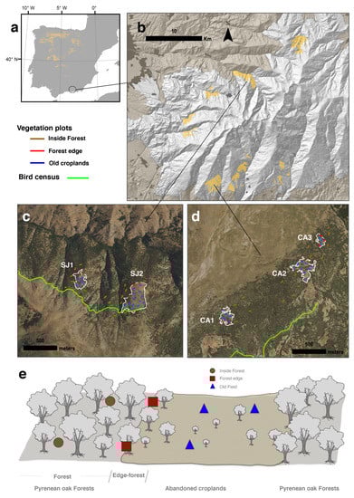 Distribution of Quercus pyrenaica forests in the Iberian Peninsula (a), and in Sierra Nevada mountain range (b). Location of the old croplands (white lines) in the study sites: Robledal de San Juan (SJ) (c), and Robledal de Cáñar (CA) (d). Names of the old croplands as in Table 1. Sampling design (e). Vegetation plots were randomly placed in the abandoned croplands (triangles), and inside the forest (circles) surrounding the old field. Several plots were also located at forest-old field edge (squares).