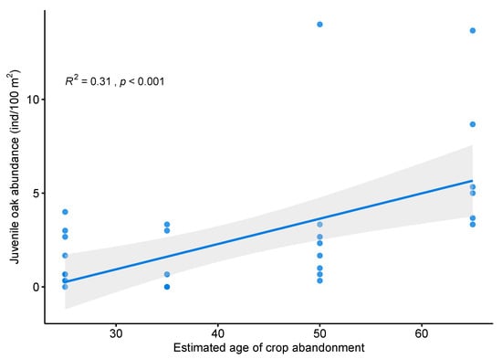 A positive relation was found between the oak juvenile abundance and the estimate age of crop abandonment (Figure 4) with higher oak juvenile abundances in the earlier abandoned croplands.