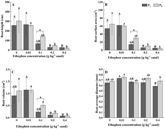 Differences in the root length (A), root surface area (B), root volume (C), root average diameter (D), root tissue density (E), and specific root length (F) between the two groups, namely phosphorus supply (1 mmol·KH2PO4, P1) and no phosphorus supply (0 mmol·KH2PO4, P0), treated with different concentrations of exogenous ethephon. Bars (mean ± standard error) accompanied by the same lowercase letter(s) are not significantly different at the 5% probability level. Different capital letters indicate significant differences between different additive concentrations under normal P supply conditions, while different lowercase letters indicate significant differences between different additive concentrations under low-P stress. * Indicates that the same additive concentration is significantly different under different P supply levels.