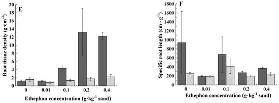 For both the P1 and P0 groups, root length, root surface area, and root volume under the 0.01 g kg−1 ethephon treatment were significantly different (p < 0.05) from those under the 0.2 and 0.4 g kg−1 ethephon treatments. The average root diameter of the plants under the 0.01 g kg−1 ethephon treatment was significantly different from that of the plants under the 0.4 g kg−1 ethephon treatment for both the P1 and P0 groups. Additionally, under the 0.01 g kg−1 ethephon treatment, root tissue density was lower than that of the plants under the 0.4 g kg−1 ethephon treatment, for both the P1 and P0 groups (Figure 1).