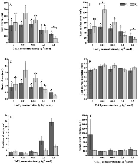 Differences in the root length (A), root surface area (B), root volume (C), root average diameter (D), root tissue density (E), and specific root length (F) between the two groups, namely phosphorus supply (1 mmol·KH2PO4, P1) and no phosphorus supply (0 mmol·KH2PO4, P0), treated with different concentrations of exogenous CoCl2. Bars (mean ± standard error) accompanied by the same lowercase letter(s) are not significantly different at the 5% probability level. Different capital letters indicate significant differences between different additive concentrations under normal P supply conditions, while different lowercase letters indicate significant differences between different additive concentrations under low-P stress. * Indicates that the same additive concentration is significantly different under different P supply levels.