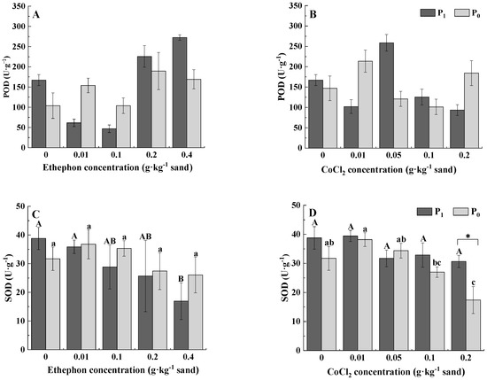 Differences in the POD activity (A,B) and SOD activity (C,D) between the two groups, namely phosphorus supply (1 mmol·KH2PO4, P1) and no phosphorus supply (0 mmol·KH2PO4, P0), treated with different concentrations of exogenous additives (ethephon and CoCl2). Bars (mean ± standard error) accompanied by the same lowercase letter(s) are not significantly different at the 5% probability level. Different capital letters indicate significant differences between different additive concentrations under normal P supply conditions, while different lowercase letters indicate significant differences between different additive concentrations under low-P stress. * Indicates that the same additive concentration is significantly different under different P supply levels.