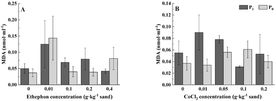 Differences in the MDA activity (A,B) between the two groups, namely phosphorus supply (1 mmol·KH2PO4, P1) and no phosphorus supply (0 mmol·KH2PO4, P0), treated with different concentrations of exogenous additives (ethephon and CoCl2).