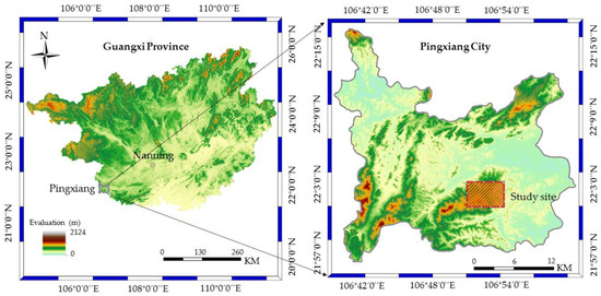 This study was conducted at the Guangxi Youyiguan Forest Ecosystem Research Station, which is a part of the Experimental Center of Tropical Forestry, Chinese Academy of Forestry. The study site is located in the center of Pingxiang City, Guangxi Province (22°02′–22°04′ N, 106°51′–106°54′ E), as shown in Figure 1, and has a southern subtropical humid climate. The annual average temperature ranges from 20.5 to 21.7 °C. In January and July, the average temperature reaches 12.5 °C and 26.0 °C, respectively. The average annual precipitation over the last 5 years is 1386 mm, with 80% of that precipitation occurring from April to September. The annual evaporation capacity is 1275 mm. The altitude ranges from 250 to 800 m. The highest mountain is the Daqing Mountain with an elevation of 1045 m and a gradient of 25–30°. The main types of landforms are hills and foothills. The soil is principally composed of laterite and red soil based on the Chinese soil classification; this soil texture is classified as ferralsols in the World Reference Base for Soil Resources. The soil thickness is generally higher than 100 cm. The main vegetation in this area includes Pinus massoniana, C. lanceolata, and other local broad-leaf tree species (Erythrophleum fordii, Castanopsis hystrix, Betula alnoides, etc.) [27]. We chose C. lanceolata plantations for this investigation based on long-term and continuous research, as the average age of C. lanceolata before thinning is 14 years.