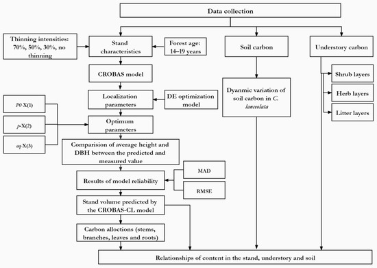 The ideas and methods for analyzing the carbon allocation proposed by Mäkelä et al. [18] and Liao et al. [20] were used to determine the effects of thinning on C. lanceolata carbon allocation, as shown in Figure 2. First, based on the CROBAS modeling framework of carbon equilibrium, a DE optimization model was constructed for three parameters, where X(1), X(2), and X(3) represent P0, p, and aq. respectively. Then, the trends in average height and DBH between the predicted and measured values for various thinning intensities were built to evaluate the MAD and RMSE of prediction accuracy and reliability obtained by the CROBAS-CL model. DBH and height provided input to the CROBAS-CL model to calculate individual tree volumes for various thinning intensities. Therefore, the carbon allocation in the various organs of C. lanceolata plantations as a function of tree age were calculated under the different thinning intensities obtained by the CROBAS-CL model. Meanwhile, the correlations and differences between carbon storage in forests and litters were also investigated to further reveal the dynamic variations of carbon content in the plantations.