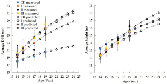 Table 3 shows the MAD and RMSE (obtained by the CROBAS-CL model) of the predicted height and DBH under different thinning intensities. The MAD of predicted height is less than 0.087, while its RMSE is less than 0.007%. The MAD of predicted DBH is less than 0.165, while its RMSE is less than 0.008%. This indicates that the deviation of height predicted by the CROBAS-CL model from the measured height is less than 0.087 m. Similarly, the deviation between the predicted and measured DBH is less than 0.165 cm. These results confirm that our model is consistent with the precision requirements.