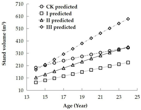 Figure 4 shows that the effect of thinning intensities on the calculated stand volume was not uniform. After implementing the high-intensity Thinning I, the predicted stand volume of C. lanceolata was reduced by 119.62–126.62 m3/hm2, as compared to that in the control group CK without thinning. For Thinning III, the stand volume started increasing in the third year after thinning began. Although Thinning II did not have an obvious impact on the stand volume, Thinning levels I and III affected it significantly (p < 0.05).