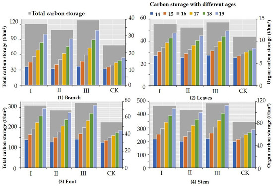 Among each organ of the C. lanceolata, the stem’s mean carbon storage value under different reserve densities accounts for 55.17% of the total average in the tree phytomass layer. Furthermore, roots also occupy a high proportion, accounting for 33.67% of carbon storages in the arbor layer. After cutting, the preservation of roots in soils can reduce carbon drainage. Branches, leaves, and roots exhibit a high proportion of carbon content. Therefore, logging residue treatment and forest recovery and renewal have a significant impact on carbon storages. After cutting, several branches, leaves, and barks can be used as fuel wood or “tempering mountains”, resulting in the decomposition of various organic matters. The organic matter in the soil surface rapidly conducts oxygen lysis, resulting in the discharge of CO2 [38]. In this study, the allocation order of carbon storages in each organ of the C. lanceolata arbor layers was observed as stems > roots > branches > leaves. This result might be similar to the allocation order in the majority of plantations globally [39,40].