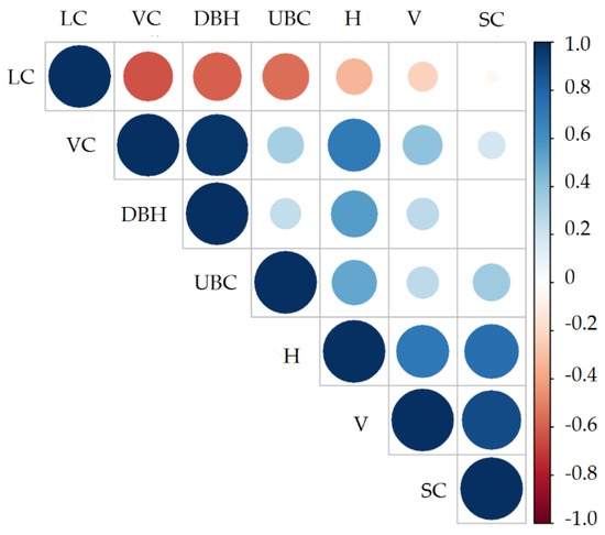 Relationship between carbon content in the stand, understory, and soil. Positive and negative correlations are shown in blue and red, respectively. The color intensity and size of the circle are proportional to the correlation coefficients. Correlations with p-value > 0.05 are considered as non-significant and indicated by blank coefficient values. Here, LC: carbon storage of litter, VC: carbon storage of forest vegetation, DBH: diameter at breast height, UBC: carbon storage of undergrowth biomass, H: height, V: volume of the forest stand, and SC: soil carbon storage.