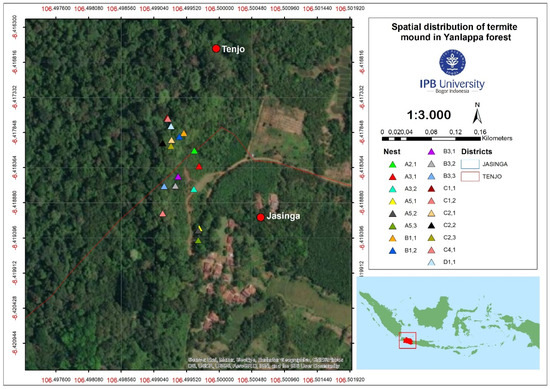 - Subekti, N. Distribution Patterns, Architecture and Population Density of Subterranean Termites Macrotermes gilvus Hagen (Blattodea: Termitidae) in Yanlappa Nature Reserve, West Java. Ph.D. Thesis, Faculty of Forestry, IPB University, Bogor, Indonesia, 2010. [Google Scholar]