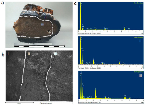 Bulk analysis of uncharred, semi-charred, and charred material (Figure 1a,b) showed the presence of aluminum (Al), calcium (Ca), magnesium (Mg), and silica (Si) (Figure 1c). Moreover, both sulfur (S) and iron (Fe) concentrations were shown to decrease in charred areas. This is more likely owed to the different porosity/permeability of the material, which is charring-dependent [17] and that did not allow Fe found in the burial environment [18,19] and S produced by the action of sulfate-reducing bacteria [18] to penetrate into the material uniformly.