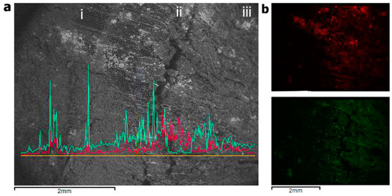EDS line-scan and mapping of a sample where all conditions coexisted. (a) Line scan of Fe (red) and S (green) (left to right the transition from charred to uncharred, i–iii); (b) mapping of Fe (red) and S (green).
