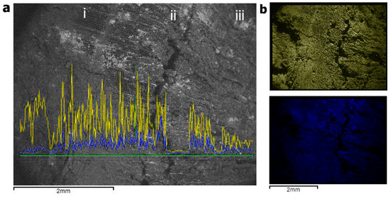 EDS Line-scan and mapping of a sample where all conditions coexisted. (a) Line scan of carbon (yellow) and oxygen (blue) (left to right the transition from charred to uncharred, i–iii); (b) mapping of carbon (yellow) and oxygen (blue).