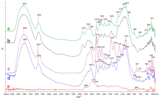 The charred archaeological sample infrared spectrum (Figure 4e) appears typical to charcoals where the broad band at 3400–3320 cm−1 representing the –OH stretching vibration of water and the peaks at 3000–2800 cm−1, due to aliphatic C‒H stretching vibration derived from methyl, methylene, and methine group, are absent, as these bands decrease in intensity with increasing temperature [11,13,28,29]. Moreover, specific bands assigned to wood components such as hemicelluloses (~1737 cm−1), lignin (~1510 and 1269 cm−1) and cellulose (1026 and ~898 cm−1) [23] and generally all bands in the “fingerprint” region 1500–900 cm−1 [23,28] are absent, displaying the chemical changes caused by pyrolysis as well [29]. Nonetheless, the charred sample spectrum presents broad bands at ~1708 cm−1, due to the acidic C=O groups, characteristic of low temperature charcoals’ spectra [11,13] and a broad band at 1610–1590 cm−1 due to lignin aromatic C=C skeletal vibrations, which have been also reported to increase in intensity with increasing charring [29].