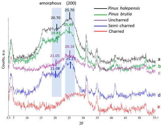 Diffractograms regarding the , (110), (102), (200), and (004) reflections of the two reference samples (P. halepensis and P. brutia) along with charred, semi-charred, and uncharred archaeological waterlogged samples are shown in Figure 5. Both reference samples and semi-charred diffractograms showed all peaks typical of reflection planes of wood cellulose [43,44,45]. In contrast, the uncharred sample diffractogram showed a considerably flattened line-shape; nonetheless, it showed a more prominent peak on the (200) plane reflection with respect to the and (110). The charred sample diffractogram, as reported by other researchers [46], appeared also flattened with a weak and broad peak regarding the (200) reflection plane, with a shifted vague maximum at ~30°.
