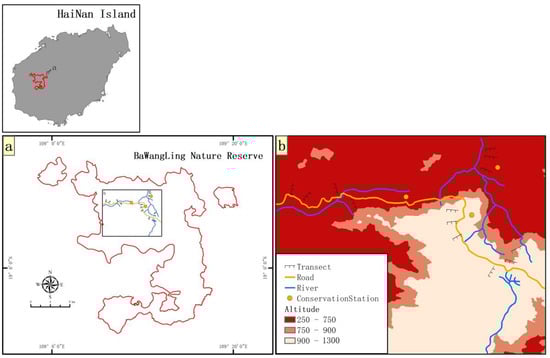 Location of soil sampling transects in Baiwang-lin Nature Reserve, Hainan Island, China. (a): Baiwang-lin Nature Reserve; (b): soil sample transects (dotted lines). The range in altitude of transects is 250–900 m. 13 transects of 250 m length were established, and along each transect there are three belt transects (2 m × 20 m) starting at and perpendicular to the forest edge.