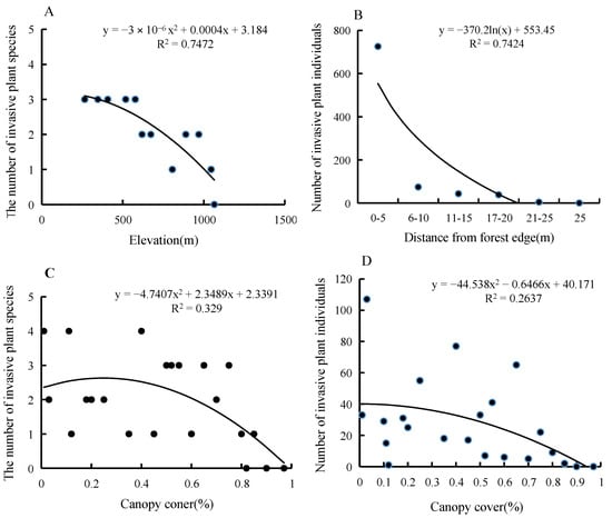 The relationship between the distribution characters and environmental factors. (A). The relationship between the number of invasive plant species and elevation; (B). The relationship between the number of invasive plant individuals and distance from forest edge; (C). The relationship between the number of invasive plant species and canopy coner; (D). The relationship between the number of invasive plant individuals and canopy cover.
