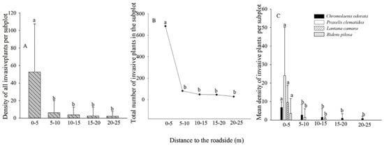 Abundance of terrestrial invasive herbs and shrubs in relation to distance from forest edge. (A). Density of invasive plants at different distances from forest edge; (B). The number of invasive plants at different distances from forest edge; (C). The density of four invasive plants at different distances from forest edge. Different lowercase letters indicate significant differences (p < 0.05).