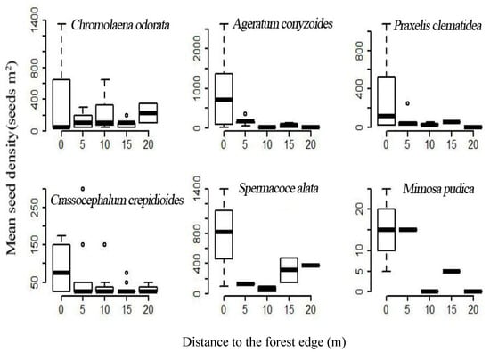 A total of 57,138 individual seedlings from 72 plant species were germinated from the 195 soil samples collected from the Baiwang-lin Nature Reserve, among which 1545 seedlings of 12 TIHS were observed (2.7% of all seedlings). The 12 TIHS were P. clematidea, C. odorata, L. camara, M. pudica, M. repens, M. diplotricha, Crassocephalum crepidioides, Tridax procumbens, Bidens pilosa, Spermacoce alata, Ageratum conyzoides, and Stachytarpheta jamaicensis. Among these species, P. clematidea, C. odorata, L. camara, and M. pudica are classified as malignant TIHS in China (REF). The seed germination density of these TIHS ranged from 25 to 7000 seeds m−2 (Table 6). Seed density of the TIHS in the soil seed bank decreased rapidly with distance from the forest edge into the forest interior (Figure 4).