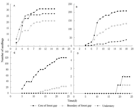 The average germination rate of TIHS was very low, being only 12.1%, 5.9%, and 2.1% in the gap core area (CA), boundary of forest gap (EA), and understory near the forest gap (UA), respectively. The germination rates for all TIHS were higher in the center of the gaps, lower at the edge of the gap, and even lower at the forest interior (Table 4, Figure 5 and Figure 6), except for M. diplotricha. The seed germination of M. diplotricha occurred within 2 to 10 days after sowing, with 31, 21, and 27 seedlings in CA, EA, and UA, respectively. The seed germination of P. clematidea occurred within 5 to 15 days after sowing, with 209, 133, and 37 seedlings in CA, EA, and UA, respectively. The seed germination of C. odorata occurred within 6 to 25 days after sowing, with 120, 23, and no seedlings in CA, EA, and UA, respectively. The seed germination of L. camara occurred within 20 to 30 days after sowing, with two, one, and no seedling(s) in CA, EA, and UA, respectively. All seedlings died within a year.