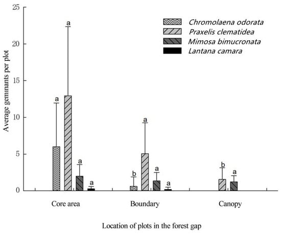 Comparison of mean germinants per plot of four species of terrestrial invasive herbs and shrubs in three different positions in the forest gap. Different lowercase letters indicate significant differences (p < 0.05).