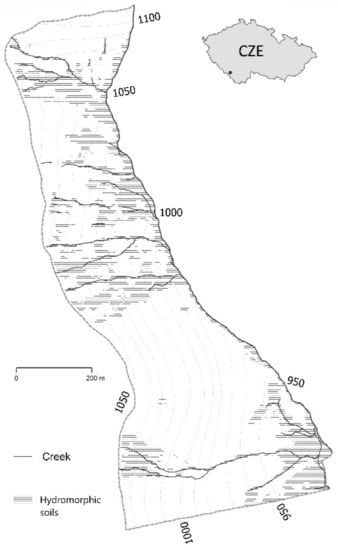 The soil survey verifying H1, established in a grid in 2015 [], provided detailed description and classification of 954 soil profiles according to the World Reference Base []. Soil hydromorphism was expressed by the presence of stagnic, gleyic and histic soil properties and in some cases even diagnostic soil horizons. In total, 11 degrees of soil hydromorphism were recognized in Boubin []. Terrestrial soils were defined as from the 0 to 3rd degrees of the water gradient (Cambisols, Podzols), hydromorphic soils were determined as from the 4th to 11th degree (Stagnosols, Gleysols, Histosols).