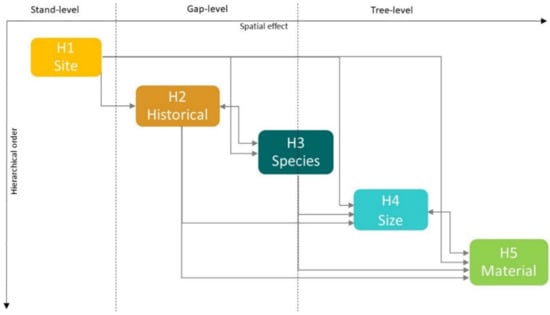 To elucidate factors of mortality in Boubin, we posed five hypotheses, spatially structured from stand- (H1) to gap- (H2–H3) and, finally, tree-level (H3–H5) (Figure 2). As it is not possible to strictly separate the mutual effect of individual factors, these formulated hypotheses may intersect and cannot be necessarily reciprocally excluded. While H1 was focused on whole-stand data, for verification of H2–H5 we chose neighboring pairs of cored disturbed and survivor trees at a maximum distance of 15 m from each other to detect mortality factors at the finest scale. The analyses and data sets used for particular hypotheses are shown in Table 1.