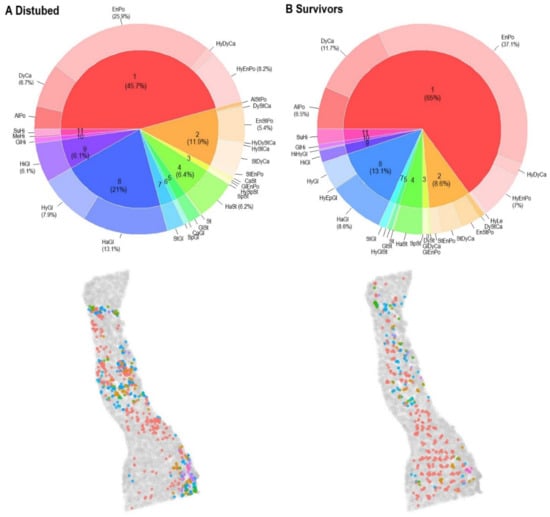 Pie and donut charts of the proportions of soil hydromorphism classes (inner pie) and soil units (outer donut) with maps of their distribution in the Boubin old-growth forest, classified by: (A) disturbed and (B) survivor trees. Proportions are depicted only if the percentage ≥5%. AlPo = Albic Podzols, DyCa = Dystric Cambisols, EnPo = Entic Podzols, HyDyCa = Hyperskeletic Dystric Cambisols, HyEnPo = Hyperskeletic Entic Podzols, HyLe = Hyperskeletic Leptosols, AlStPo = Albic Stagnic Podzols, DyStCa = Dystric Stagnic Cambisols, EnStPo = Entic Stagnic Podzols, HyDyStCa = Hyperskeletic Dystric Stagnic Cambisols, HyStCa = Hyperskeletic Stagnic Cambisols, StDyCa = Stagnic Dystric Cambisols, StEnPo = Stagnic Entic Podzols, CaSt = Cambic Stagnosols, DySt = Dystric Stagnosols, GlDyCa = Gleyic Dystric Cambisols, GlEnPo = Gleyic Entic Podzols, HySpSt = Hyperkeletic Spodic Stagnosols, SpSt = Spodic Stagnosols, HaSt = Haplic Stagnosols, St = Stagnosols, GlSt = Gleyic Stagnosols, HyGlSt = Hyperskeletic Gleyic Stagnosols, CaGl = Cambic Gleysols, SpGl = Spodic Gleysols, StGl = Stagnic Gleysols, HaGl = Haplic Gleysols, HyEpGl = Hyperskeletic Epileptic Gleysols, HyGl = Hyperskeletic Gleysols, HiGl = Histic Gleysols, HiHyGl = Histic Hyperskeletic Gleysols, GlHi = Gleyic Histosols, MeHI = Mezic Histosols, SuHI = Supric Histosols.