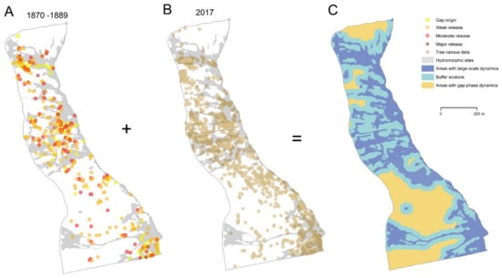 Maps of the spatial pattern of severe disturbances in Boubin, based on dendrochronological (A) and tree census (B) data and a map of the spatially-explicit mixed disturbance regime (C), derived on the basis of the soil hydromorphism map plus dendrochronological and tree census data.