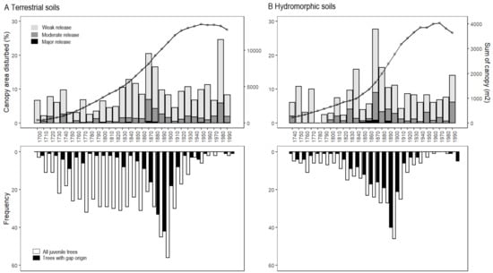 The summary disturbance history of areas with terrestrial soils differed from hydromorphic sites in both the canopy area disturbed and gap origin (Figure 5). Although the mean disturbance rate was roughly the same, about 8% per decade for both datasets, trees on hydromorphic soils showed a lower reaction disturbance rate throughout most studied periods, with substantial canopy loss in the 1840s and 1870s (15.9% CAD, 27.7% CAD, respectively) after the series of windstorms and consequent outbreak of Ips typographus L. (Figure 5B, upper part). In contrast, on terrestrial soils we identified more or less stable canopy disturbances in every decade (Figure 5A, upper part), with two periods of higher canopy disturbances in the 1870s (20.5% CAD) and 1980s (24.6% CAD), due to the massive dye off of Abies alba enhanced by atmospheric pollution [] as well as drought episodes [] in Central Europe. While regeneration in gaps dominated hydromorphic stands throughout almost entire 19th century and culminating in the 1890s (Figure 5B, bottom part), trees occupying terrestrial stands poorly regenerated in gaps (Figure 5A, bottom part), with the exception of the period following windstorms in the 1870s.